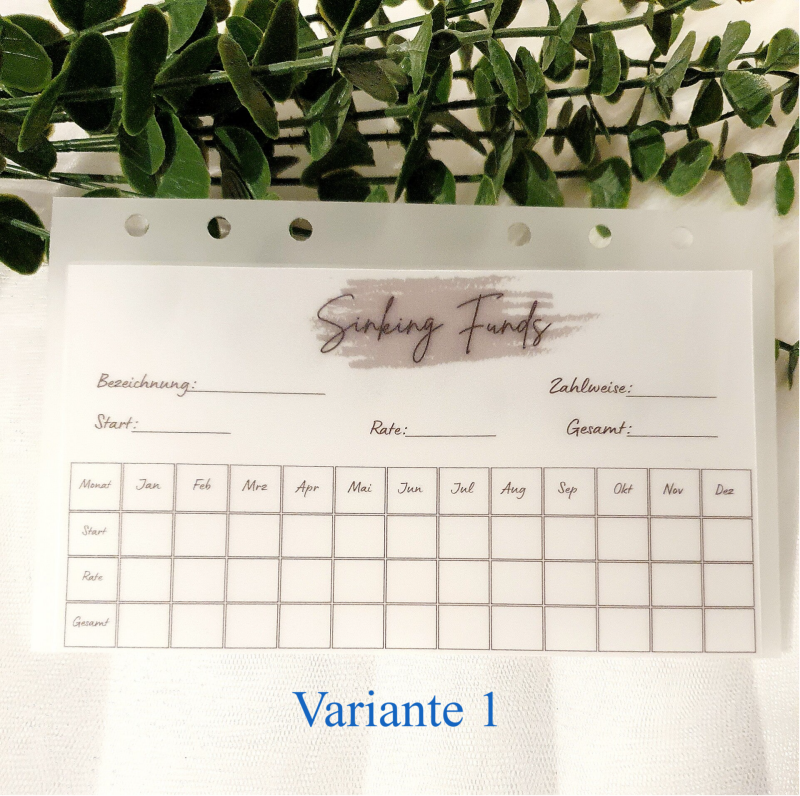 Die Sinking Funds Tracker als Einlage passend für A6 Hüllen gedruck auf 250g Papier/laminiert.